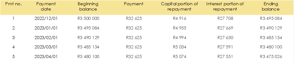 - Interest – what the bank charges you for lending the money, usually quoted relative to the prime lending rate in South Africa.