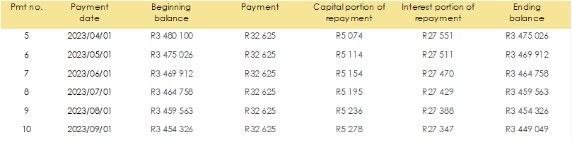 Paying extra reduces outstanding capital, which lowers interest charges. Over time, this means more of each repayment goes toward the capital, helping you pay off your bond faster and save on interest. Compare table 2 and table 3 below.